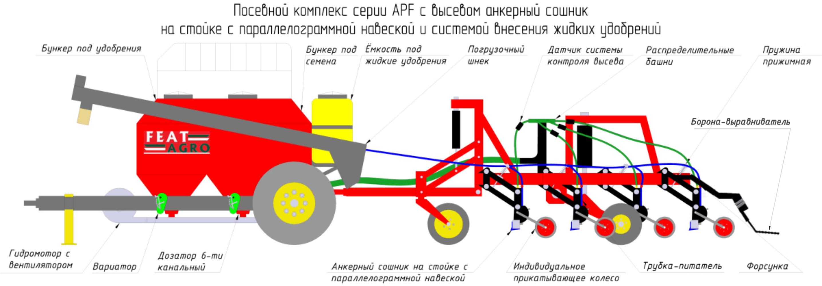Высокоточное внесение семян и удобрений гарантированно, благодаря независимому сошнику с параллелограммной навеской, а прикатывающие колеса с шинами атмосферного давления позволяют работать в любых условиях, в том числе в условиях высокой влажности почвы. Конструкция стойки посевного комплекса с высевом в анкерный сошник на параллелограмме также гарантирует высокую способность прохождения пожнивных остатков. Данный посевной комплекс предназначен для строчного посева зерновых, зернобобовых и мелкосемянных культур по необработанному фону.