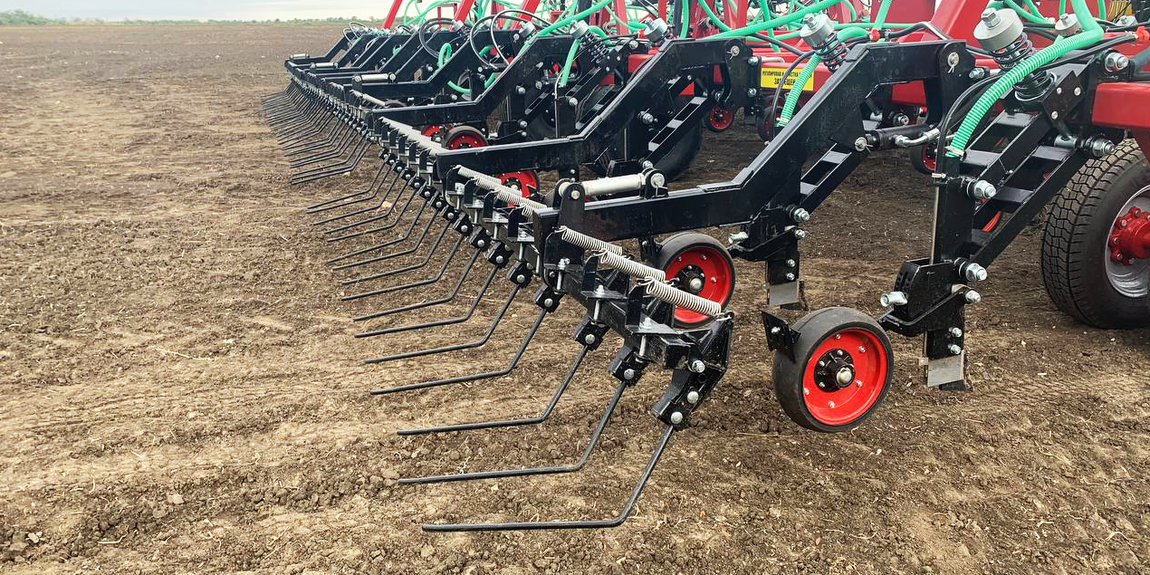 Рабочая часть (рама) посевного комплекса оснащена четырьмя рядами стоек 25х80 из стали 60С2А с анкерными сошниками толщиной 12мм с наплавкой твердосплавной пластины ВК8. Стойка с параллелограммной навеской позволяет создать давление на почву до 137 кг, что позволяет качественно обрабатывать почву на заданную глубину в разных климатических условиях и обеспечивает идеальное копирование поля.