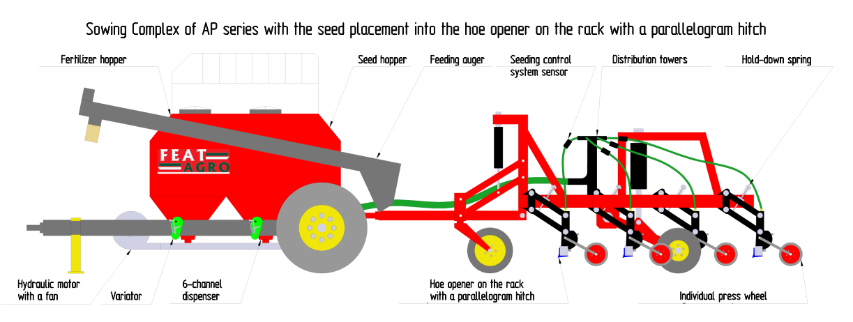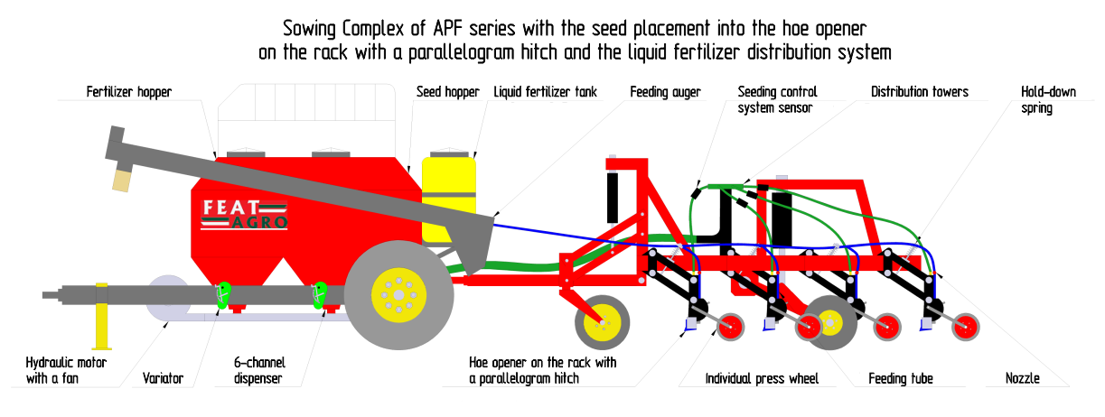 The combined sowing complex “FEAT” with the seed placement into the anchor coulter is designed for gutter sowing of cereal, legume and small-seeded crops simultaneously with granulated fertilizers on the untreated background.