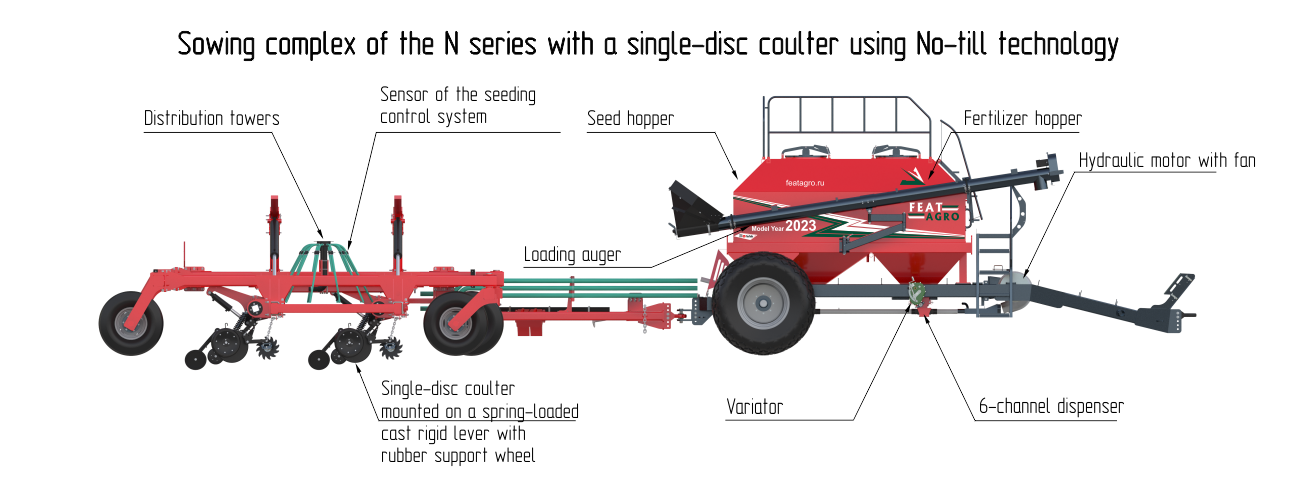 The sowing complex of N series is designed for sowing grains, legumes, oilseeds, as well as grasses using minimal (Mini-till) and zero (No-till) technologies with the simultaneous application of dry granulated fertilizers. A distinctive feature of this sowing complex is a single-disc coulter mounted on a spring-loaded cast rigid lever with a rubber support wheel, which allows you to develop a cutting force of up to 180 kg.
