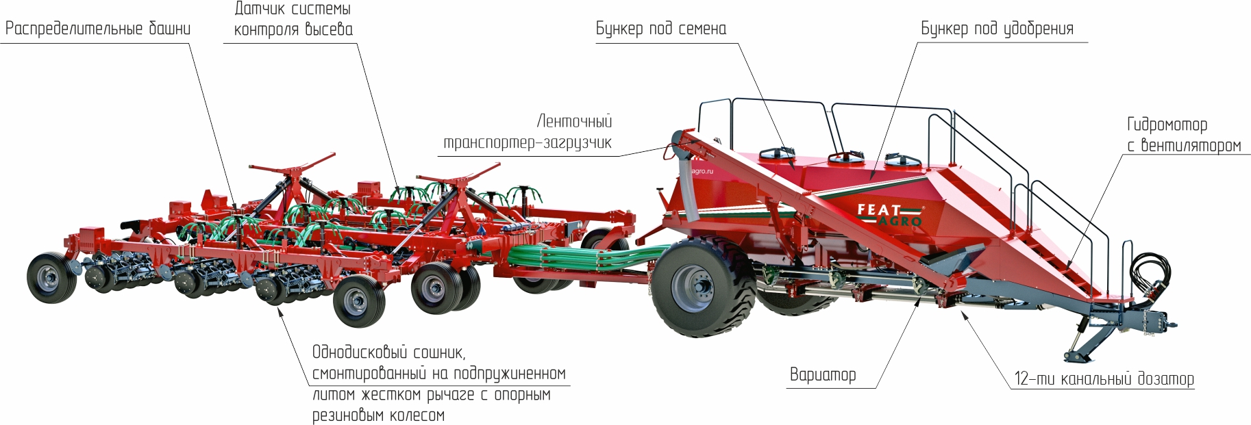 Трехсекционный пневматический бункер для семян и удобрений FEATAGRO – это высокотехнологичный агрегат, который позволяет при посеве сельскохозяйственных культур комбинировать различные типы сухих гранулированных удобрений с семенами зерновых, зернобобовых и мелкосемянных культур (например, одновременно вносить стартовые удобрения, сложные удобрения и семена), а также расширенный диапазон настроек высевающих аппаратов бункера позволяет высевать кормосмеси (например, одновременно высевать до трех видов трав или других сельскохозяйственных культур).